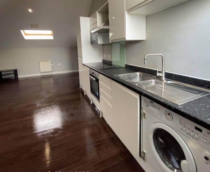 Fully fitted kitchen equipped with an oven, stove, washing machine, and ample storage space.