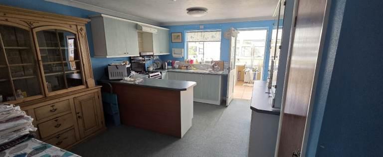 Windows to the side and rear aspects. Includes roll-edge work surfaces with breakfast bar, inset stainless steel sink with mixer tap, tiled splashbacks, plumbing for a washing machine, single radiator, and door providing side access.