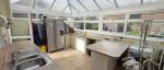 Windows to the side and rear aspects. Includes roll-edge work surfaces with breakfast bar, inset stainless steel sink with mixer tap, tiled splashbacks, plumbing for a washing machine, single radiator, and door providing side access.